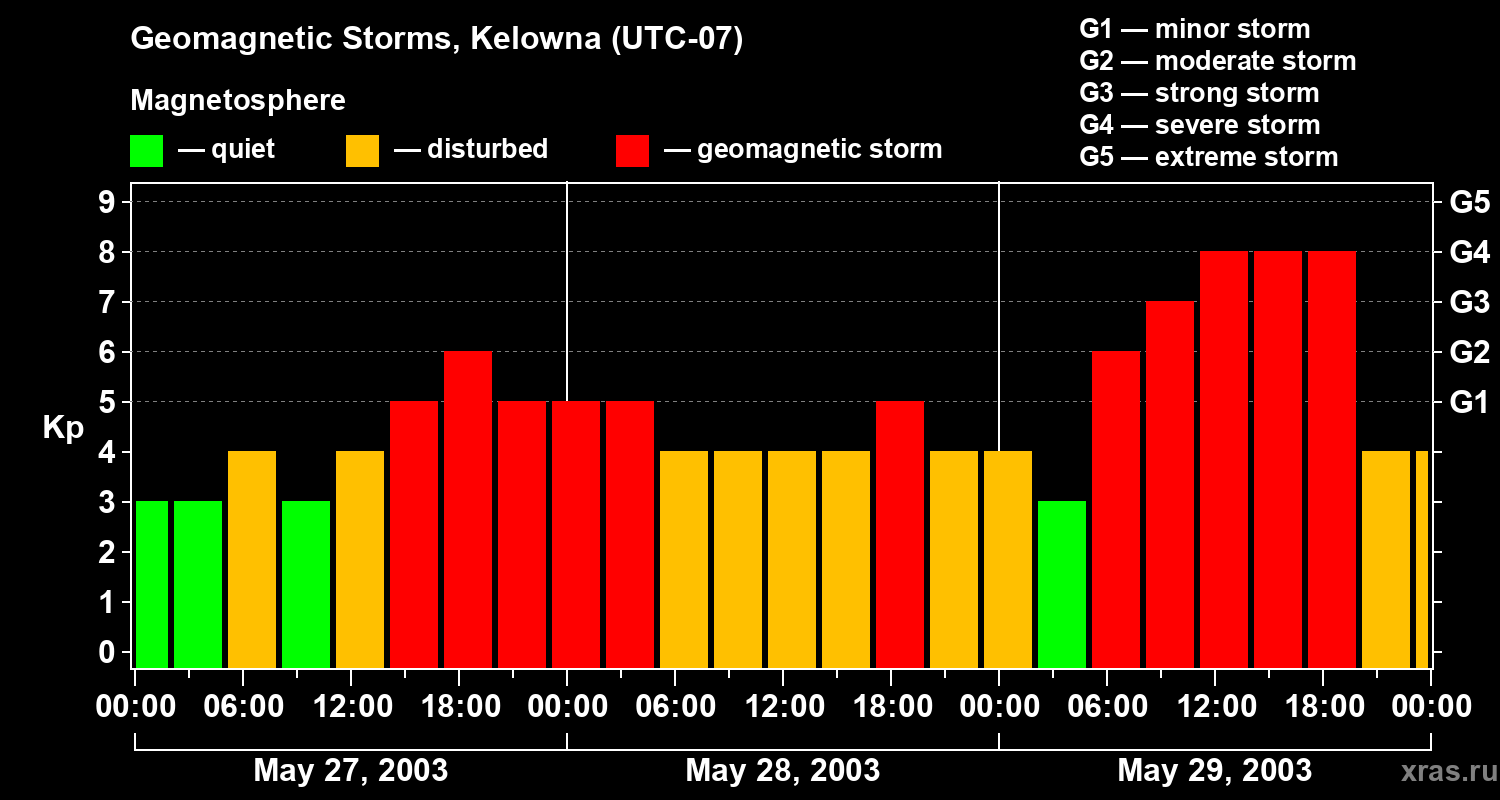 Changes in the geomagnetic index Kp from May 27 to 29, 2003 for mid latitudes