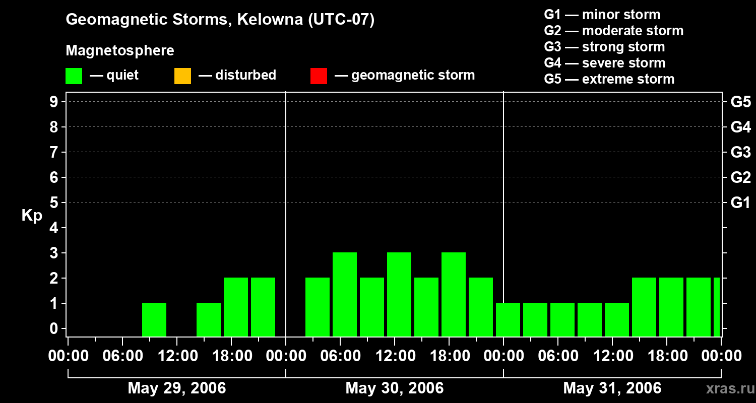 Changes in the geomagnetic index Kp from May 29 to 31, 2006 for mid latitudes