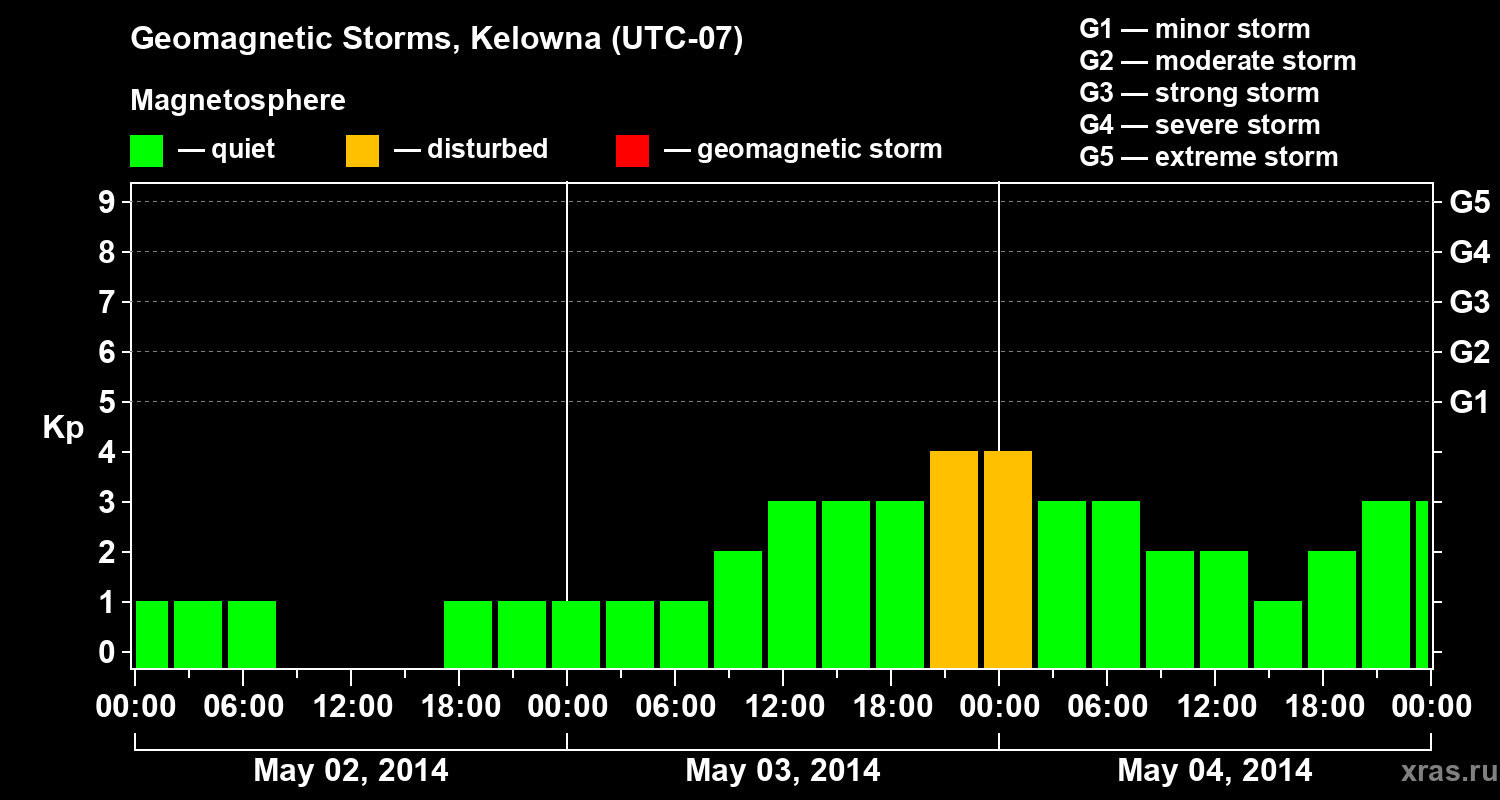 Changes in the geomagnetic index Kp from May 2 to 4, 2014 for mid latitudes