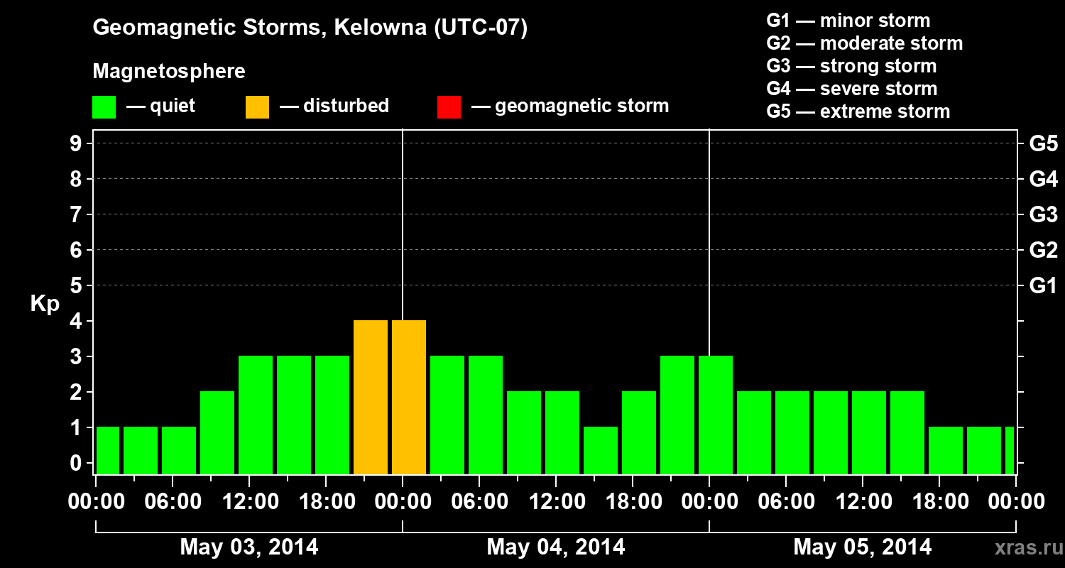 Changes in the geomagnetic index Kp from May 3 to 5, 2014 for mid latitudes