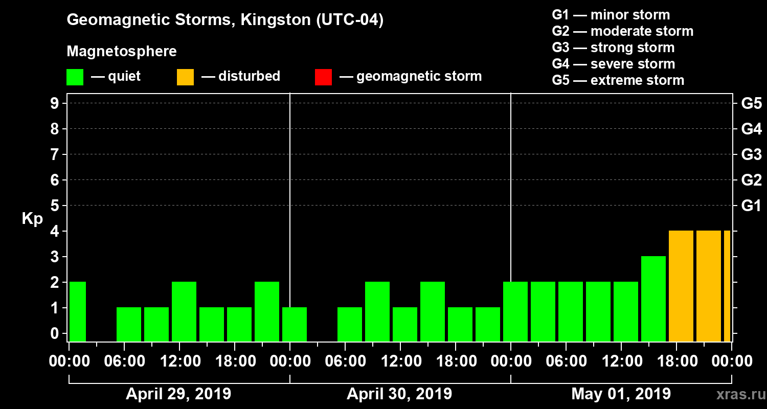 Changes in the geomagnetic index Kp from April 29 to May 1, 2019 for mid latitudes