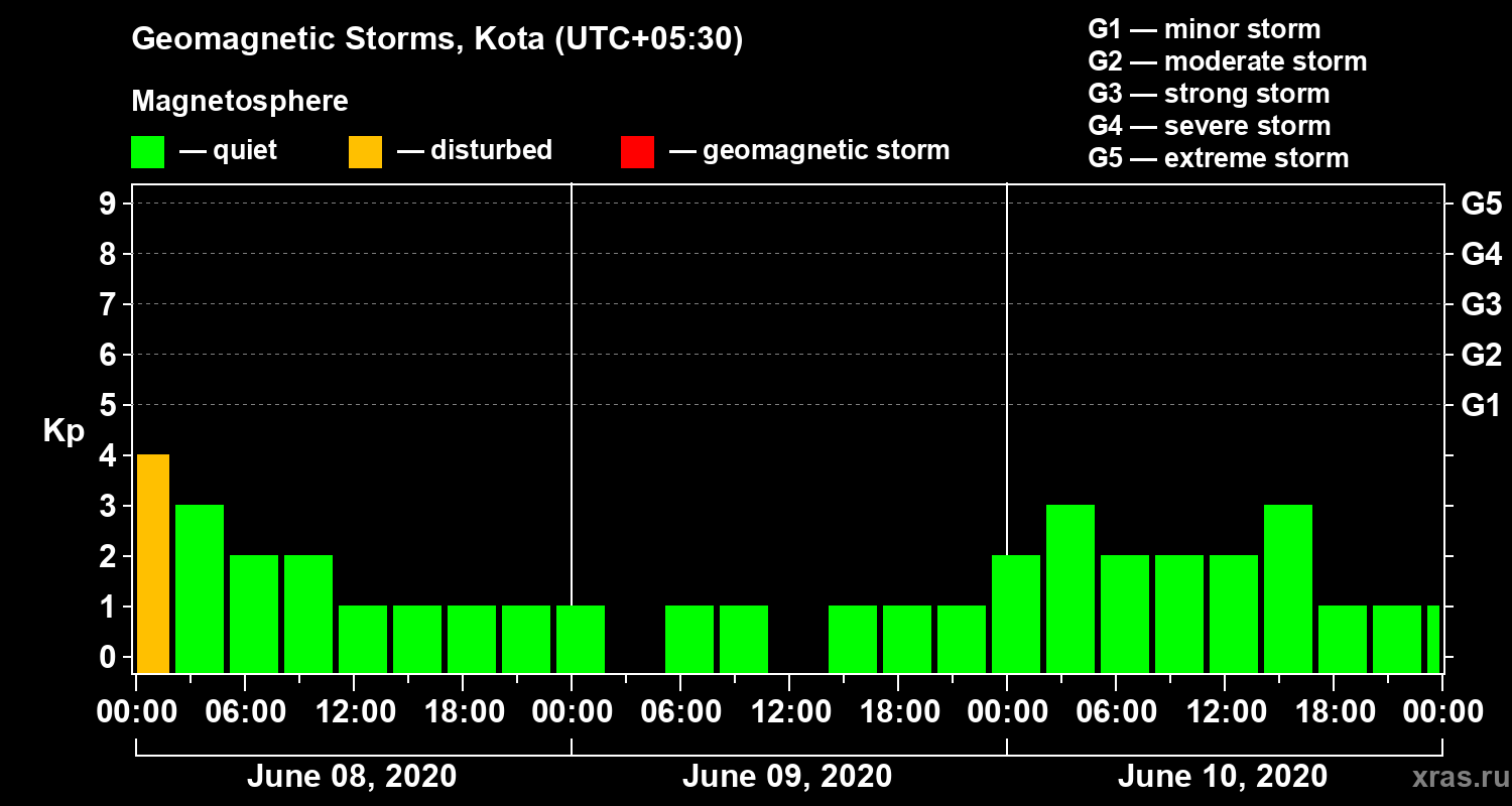 Changes in the geomagnetic index Kp from June 8 to 10, 2020 for mid latitudes
