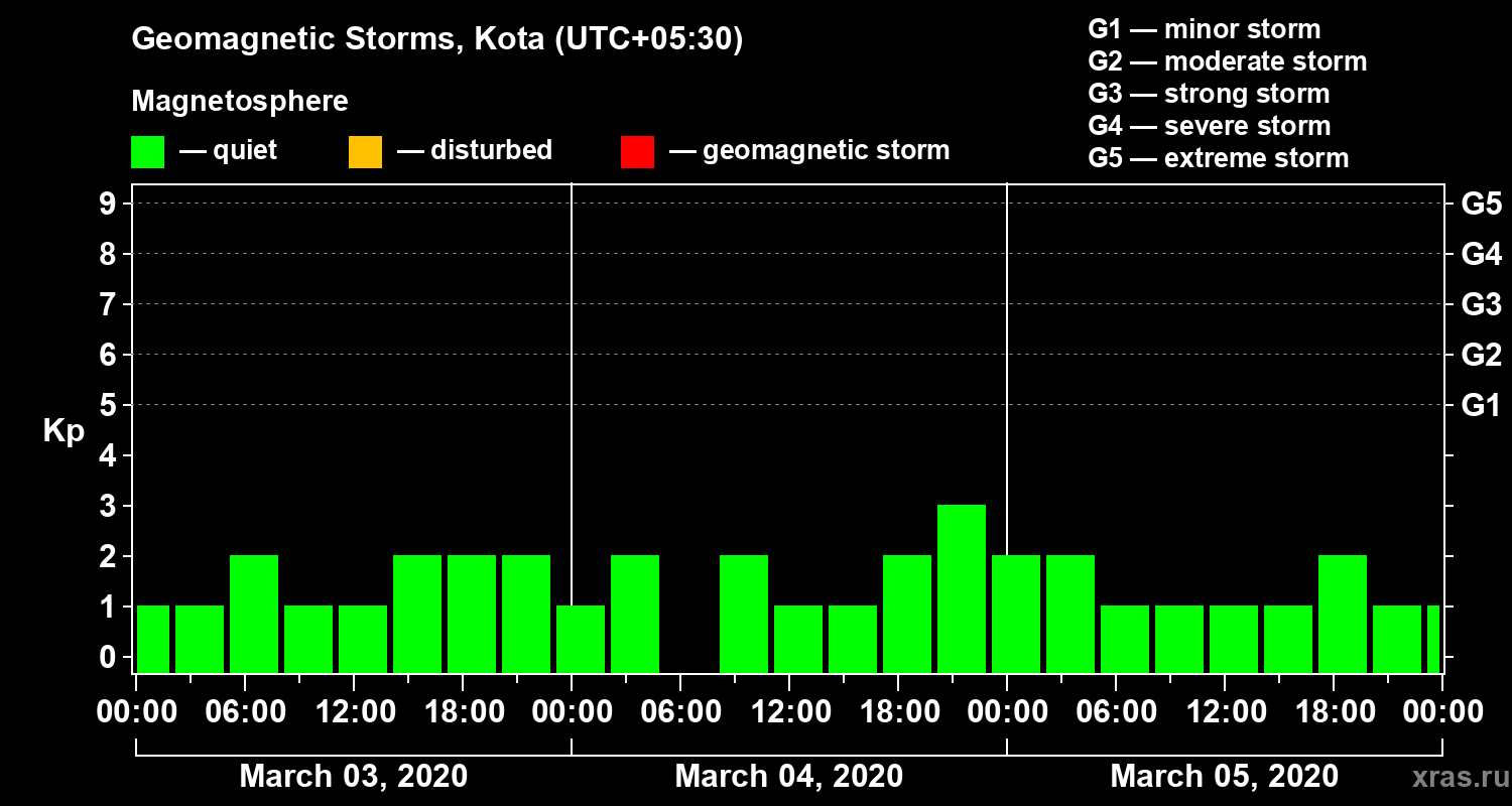 Changes in the geomagnetic index Kp from March 3 to 5, 2020 for mid latitudes
