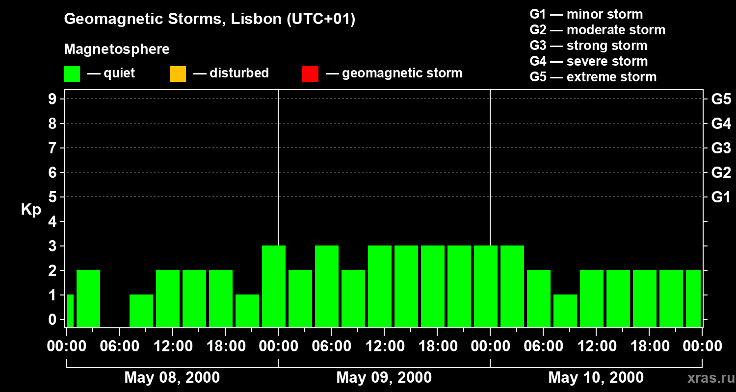 Changes in the geomagnetic index Kp from May 8 to 10, 2000 for mid latitudes