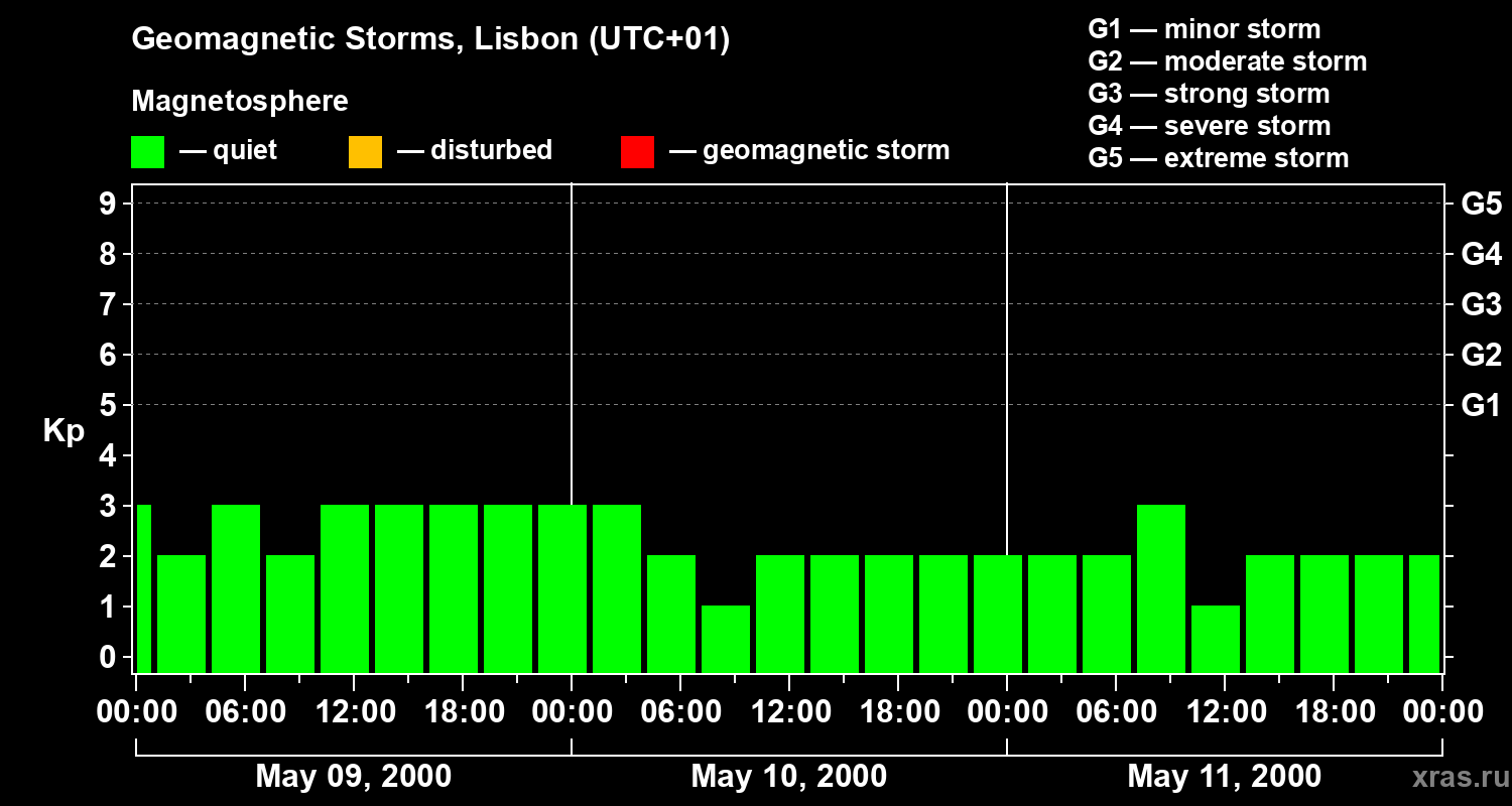 Changes in the geomagnetic index Kp from May 9 to 11, 2000 for mid latitudes