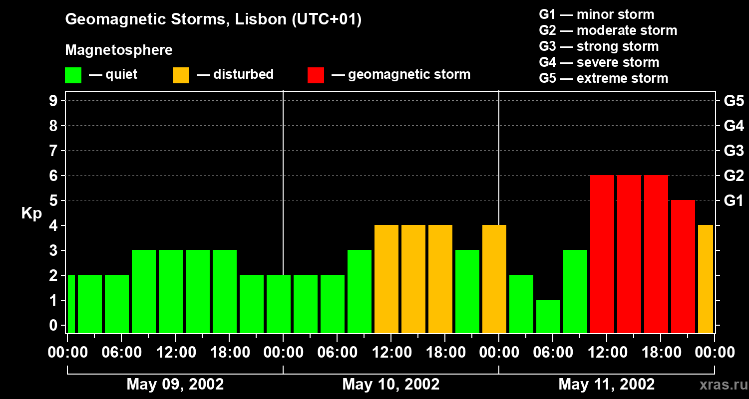 Changes in the geomagnetic index Kp from May 9 to 11, 2002 for mid latitudes