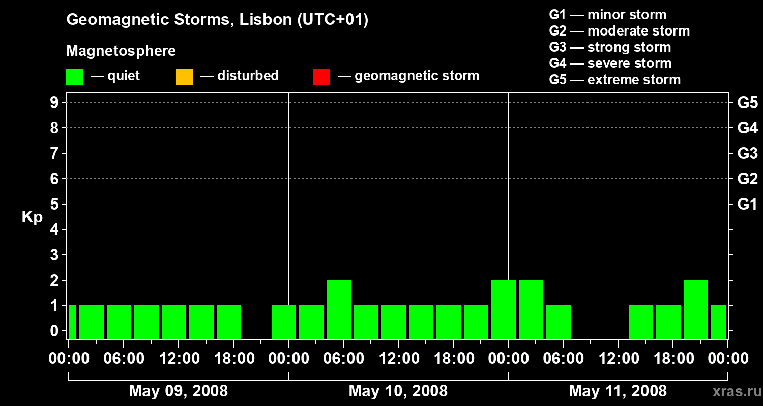 Changes in the geomagnetic index Kp from May 9 to 11, 2008 for mid latitudes