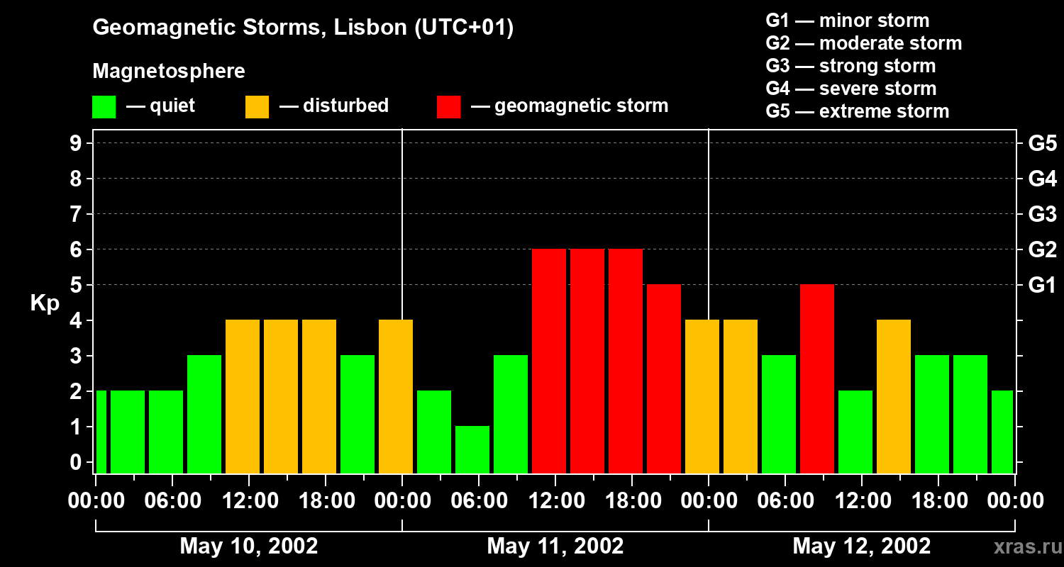 Changes in the geomagnetic index Kp from May 10 to 12, 2002 for mid latitudes