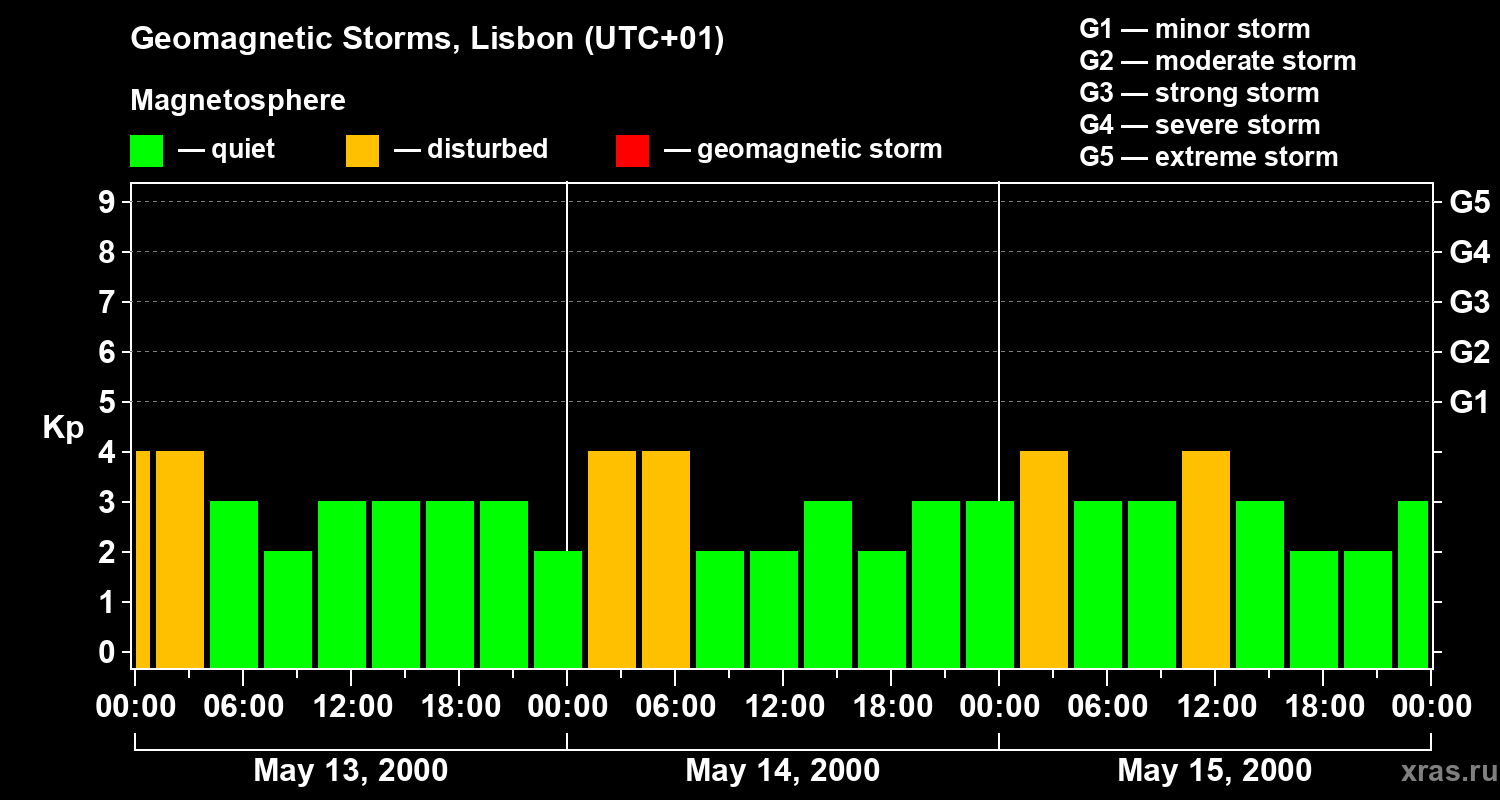 Changes in the geomagnetic index Kp from May 13 to 15, 2000 for mid latitudes