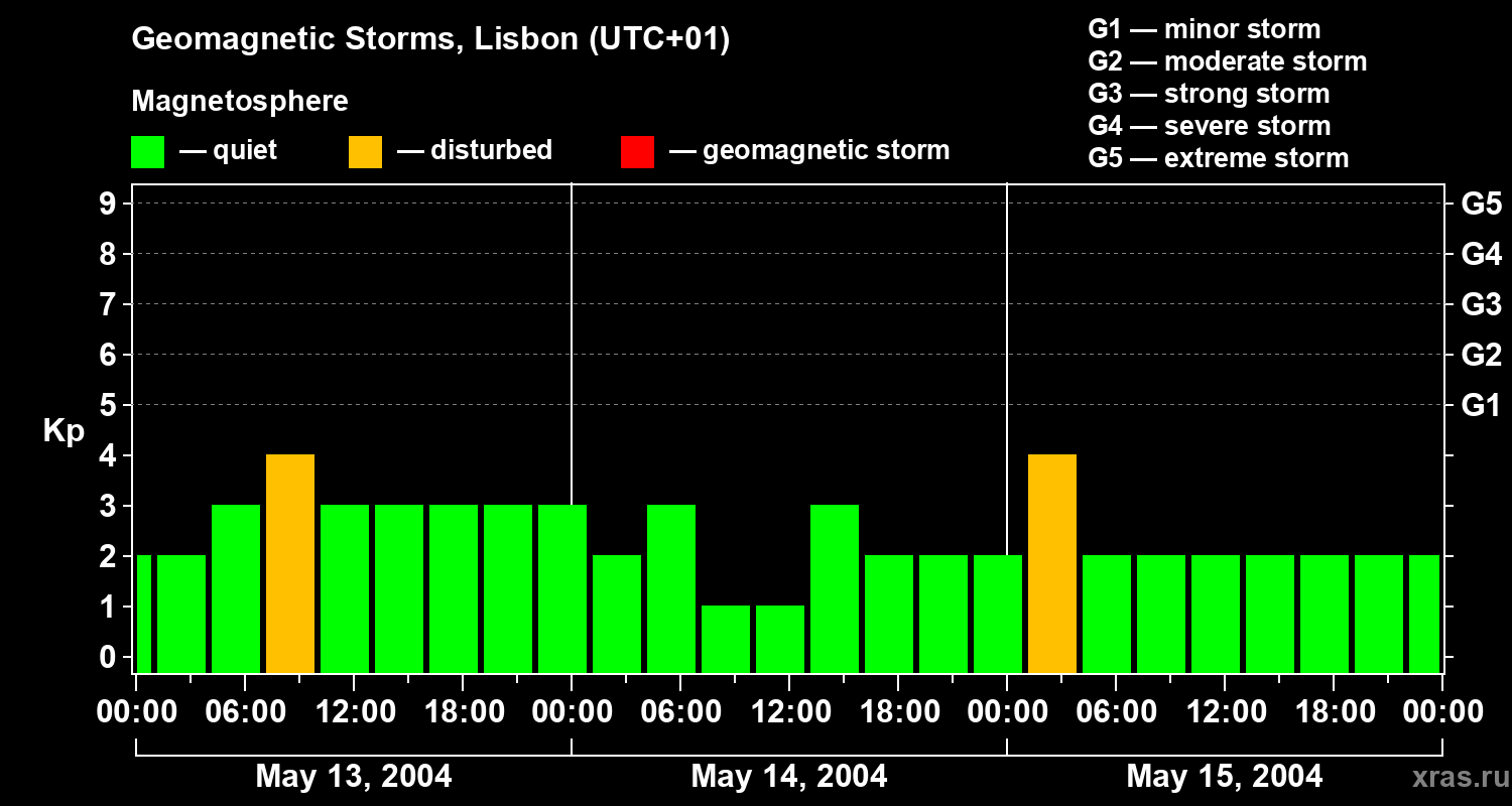Changes in the geomagnetic index Kp from May 13 to 15, 2004 for mid latitudes