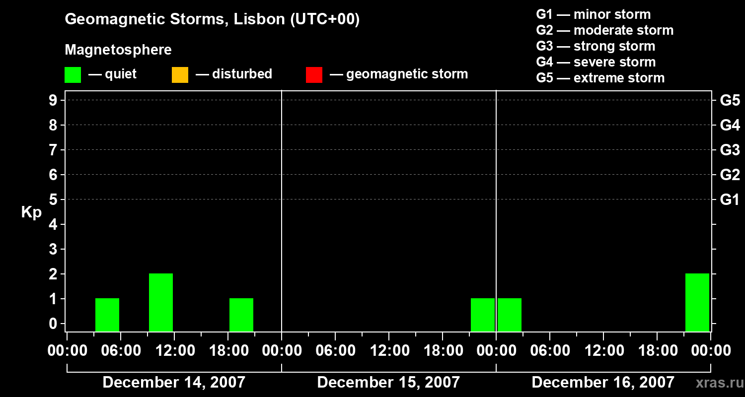 Changes in the geomagnetic index Kp from December 14 to 16, 2007 for mid latitudes