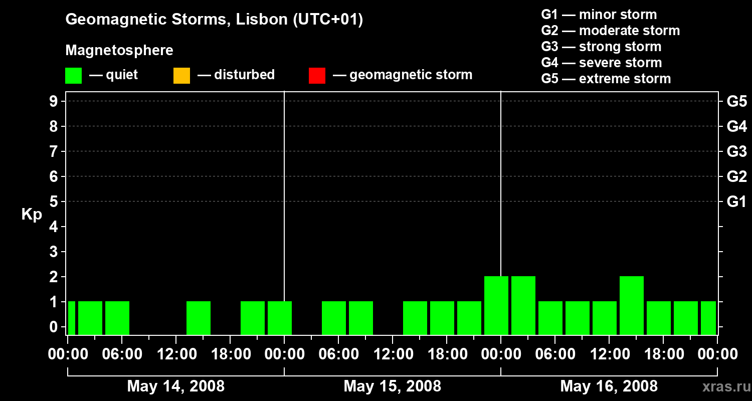 Changes in the geomagnetic index Kp from May 14 to 16, 2008 for mid latitudes
