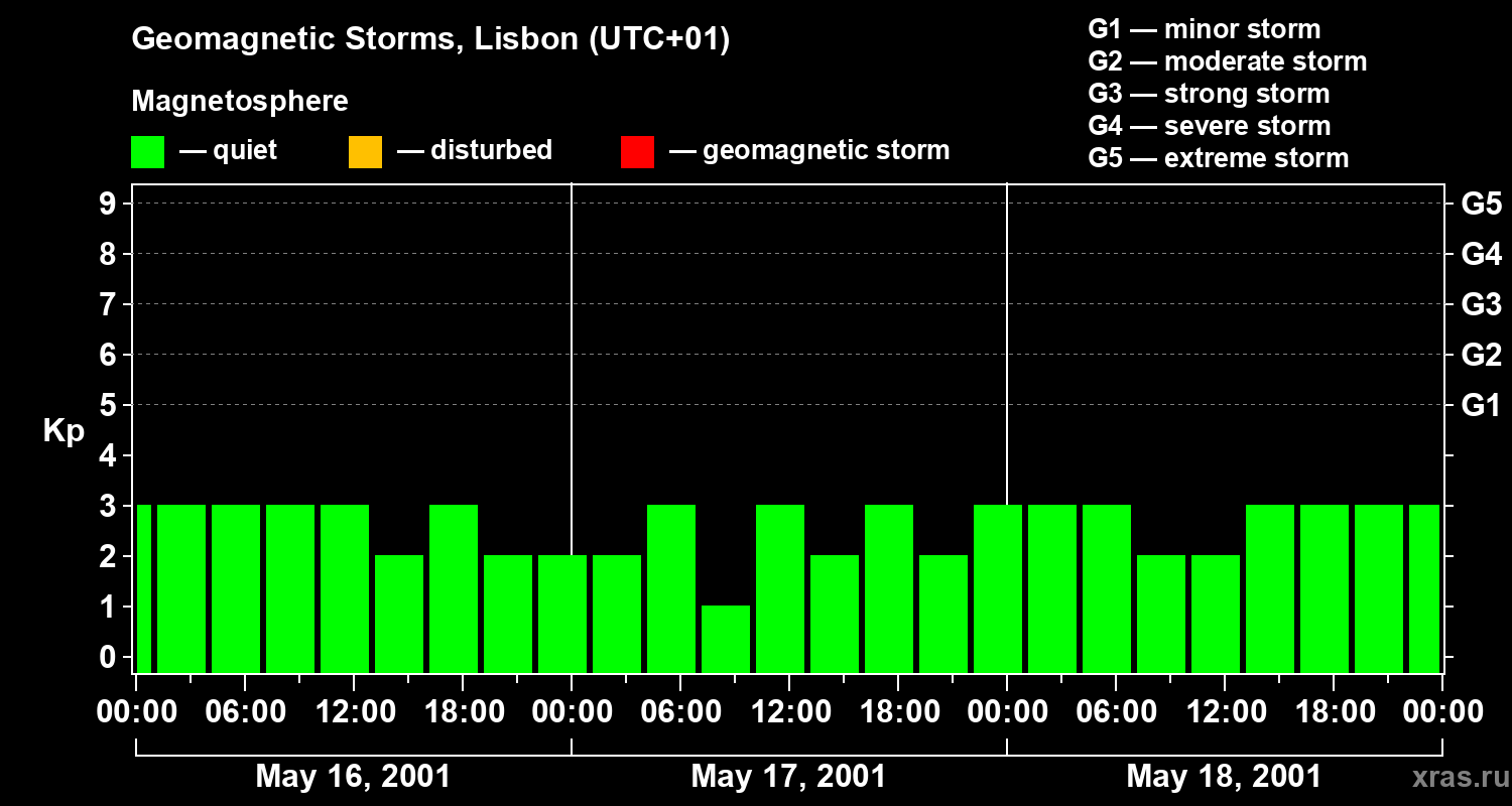 Changes in the geomagnetic index Kp from May 16 to 18, 2001 for mid latitudes