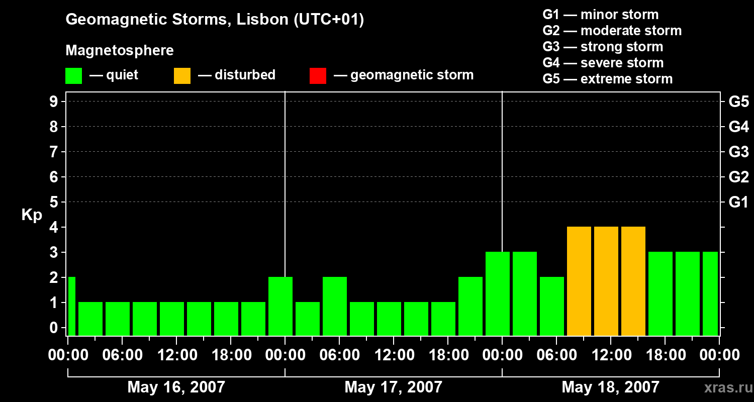 Changes in the geomagnetic index Kp from May 16 to 18, 2007 for mid latitudes
