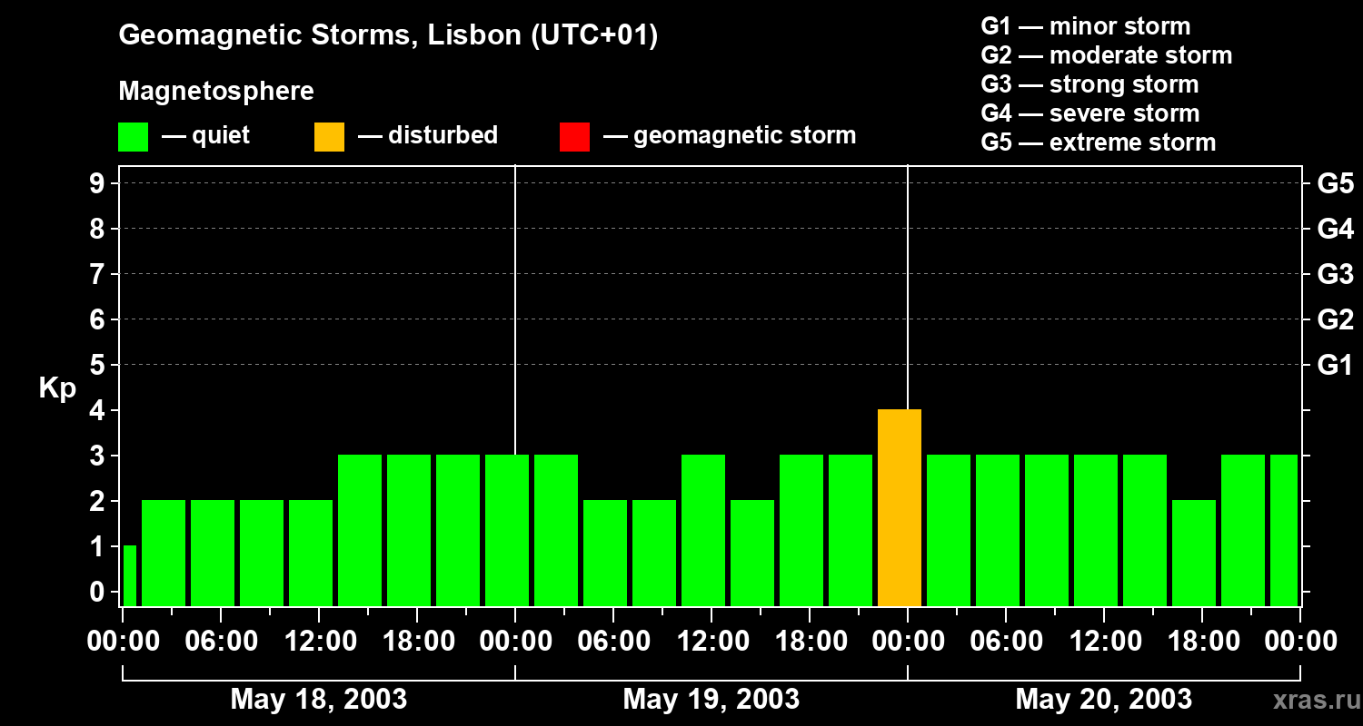 Changes in the geomagnetic index Kp from May 18 to 20, 2003 for mid latitudes