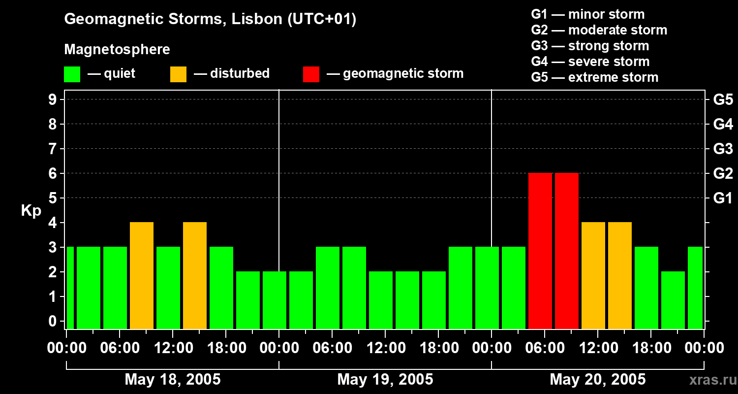 Changes in the geomagnetic index Kp from May 18 to 20, 2005 for mid latitudes