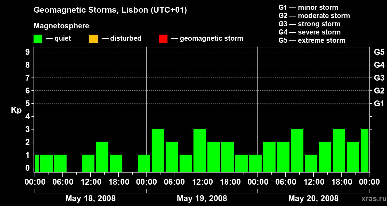 Changes in the geomagnetic index Kp from May 18 to 20, 2008 for mid latitudes
