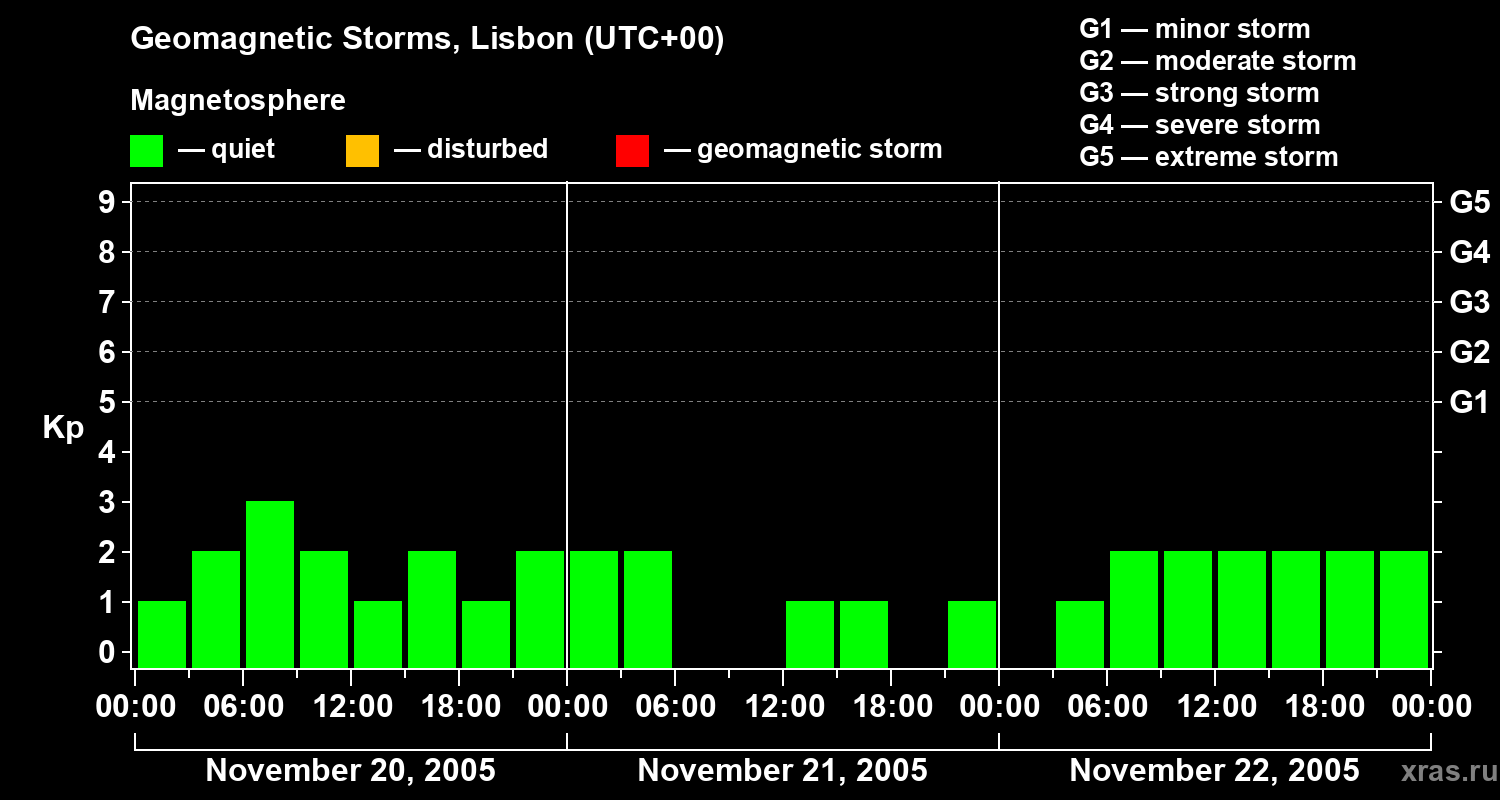 Changes in the geomagnetic index Kp from November 20 to 22, 2005 for mid latitudes