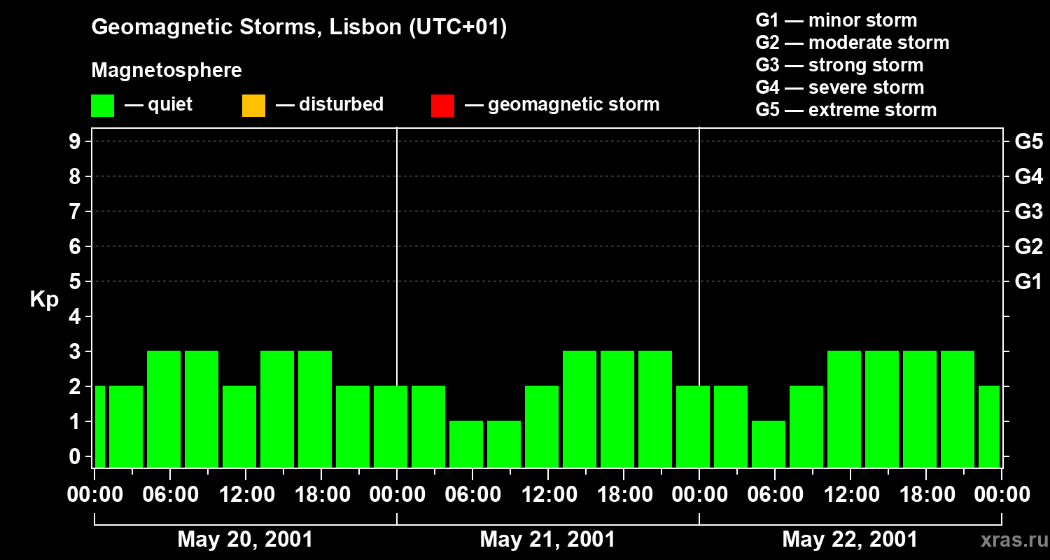 Changes in the geomagnetic index Kp from May 20 to 22, 2001 for mid latitudes
