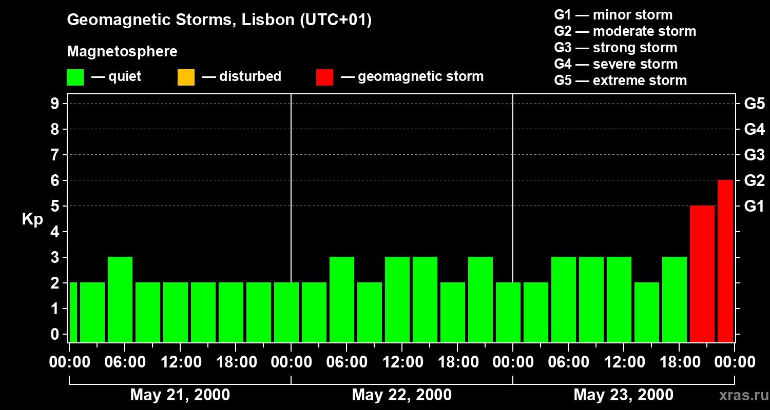 Changes in the geomagnetic index Kp from May 21 to 23, 2000 for mid latitudes
