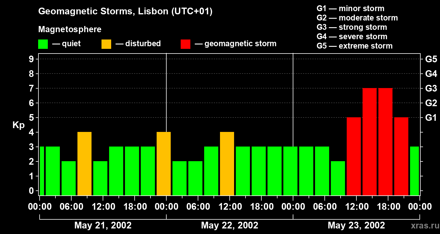 Changes in the geomagnetic index Kp from May 21 to 23, 2002 for mid latitudes
