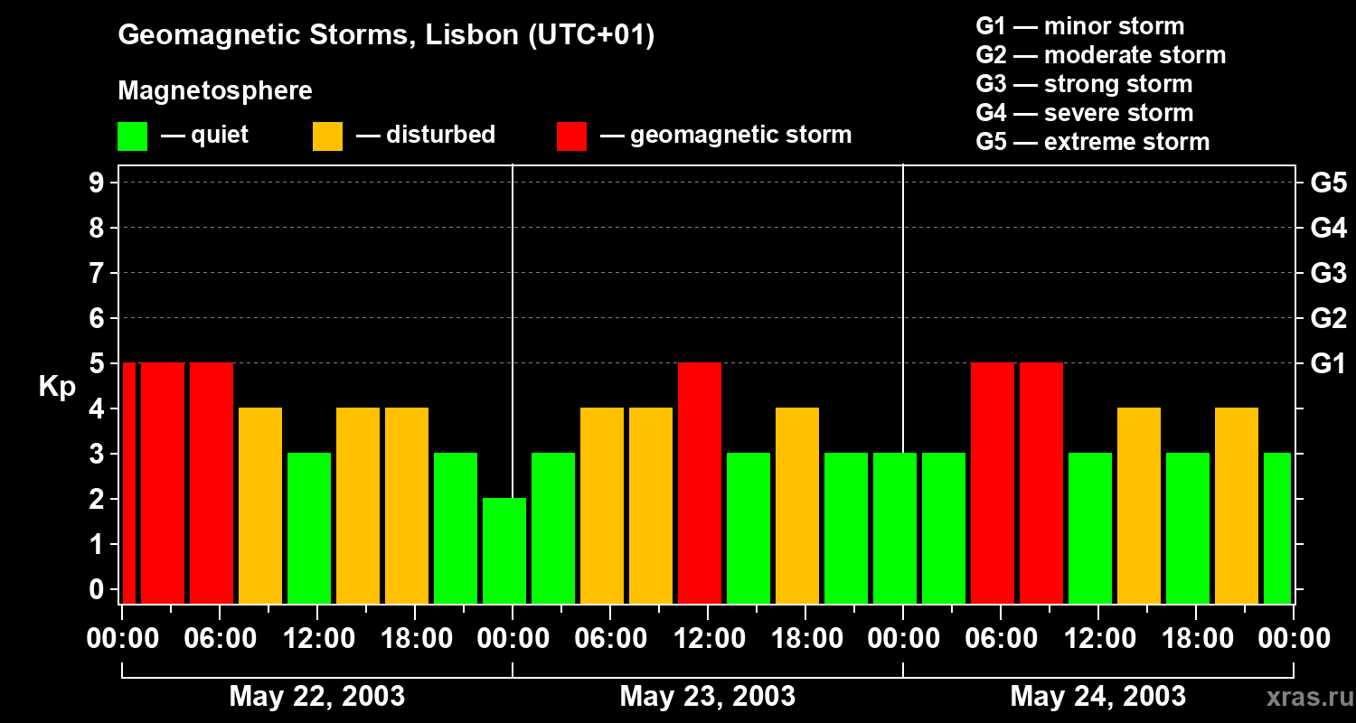 Changes in the geomagnetic index Kp from May 22 to 24, 2003 for mid latitudes