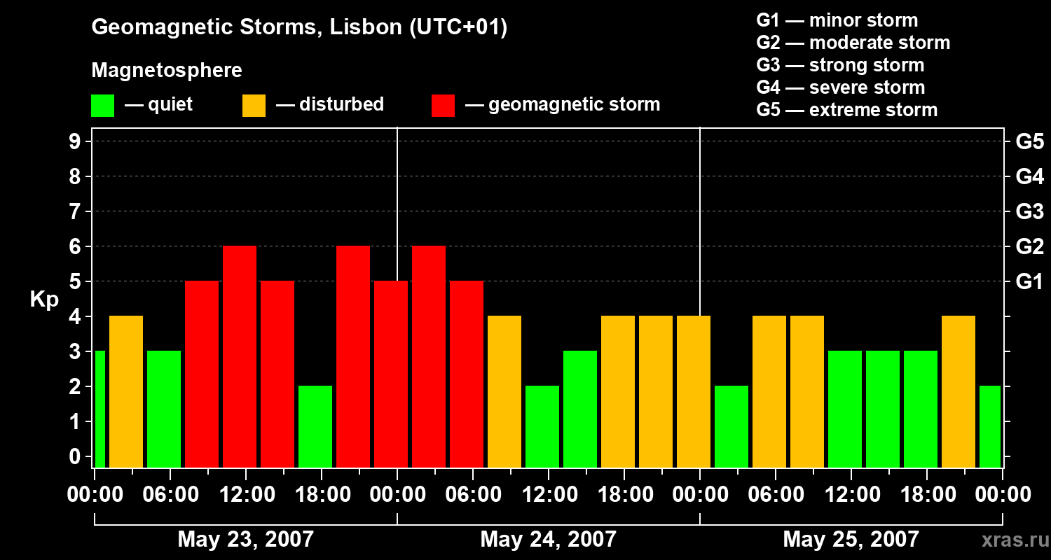 Changes in the geomagnetic index Kp from May 23 to 25, 2007 for mid latitudes