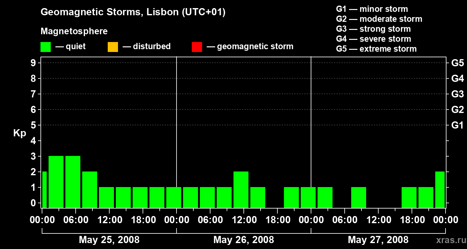 Changes in the geomagnetic index Kp from May 25 to 27, 2008 for mid latitudes