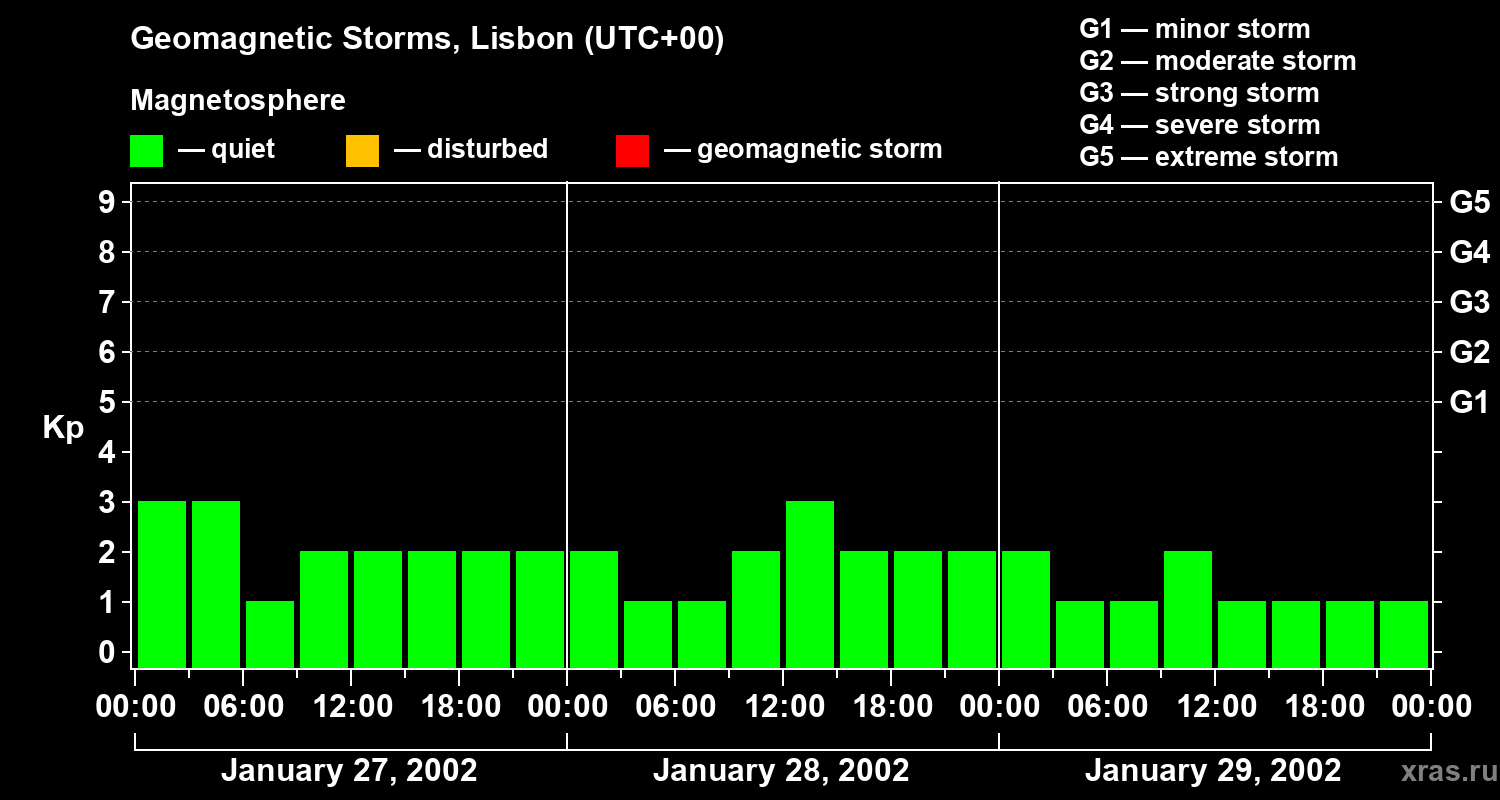 Changes in the geomagnetic index Kp from January 27 to 29, 2002 for mid latitudes