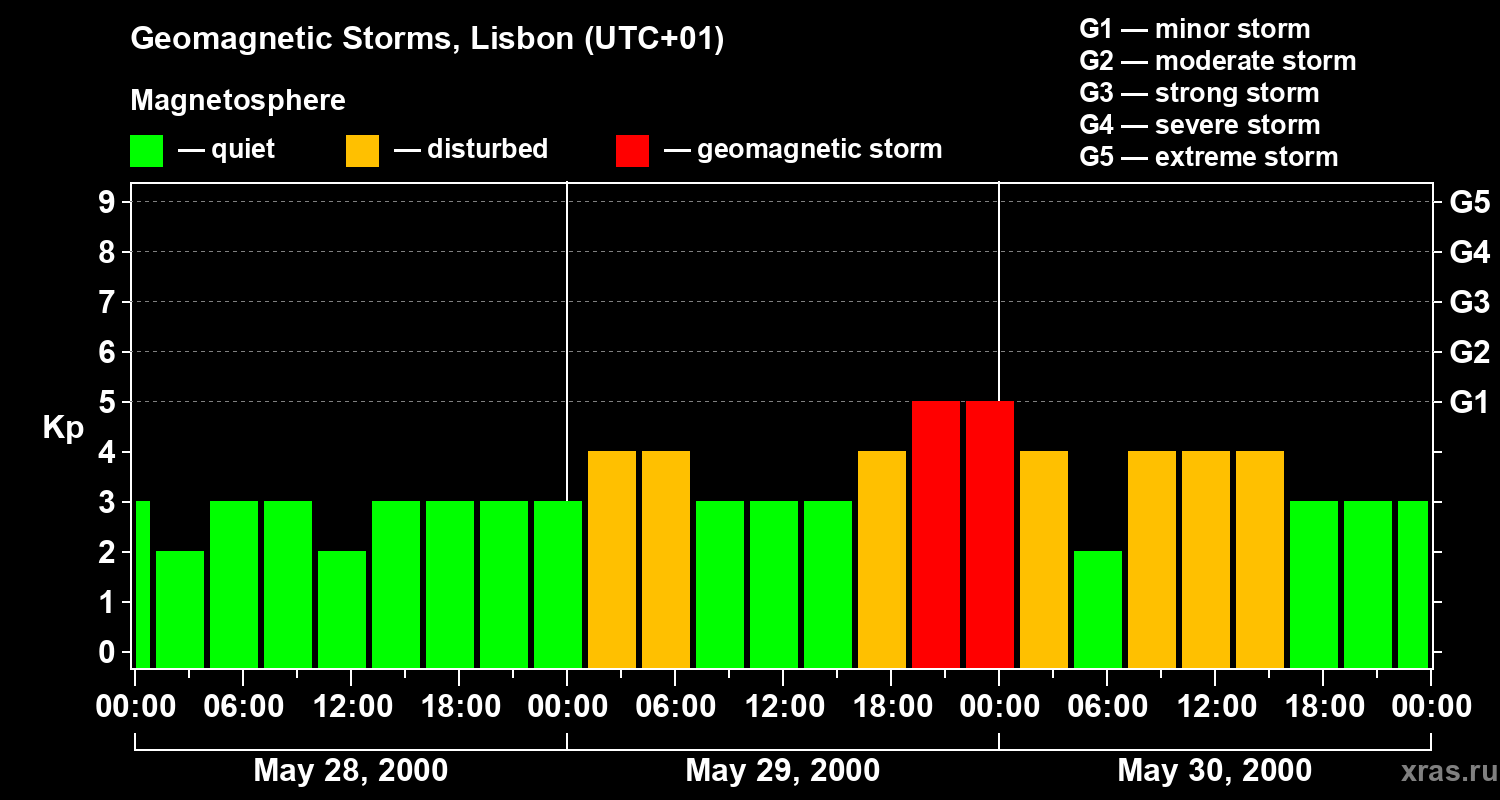Changes in the geomagnetic index Kp from May 28 to 30, 2000 for mid latitudes