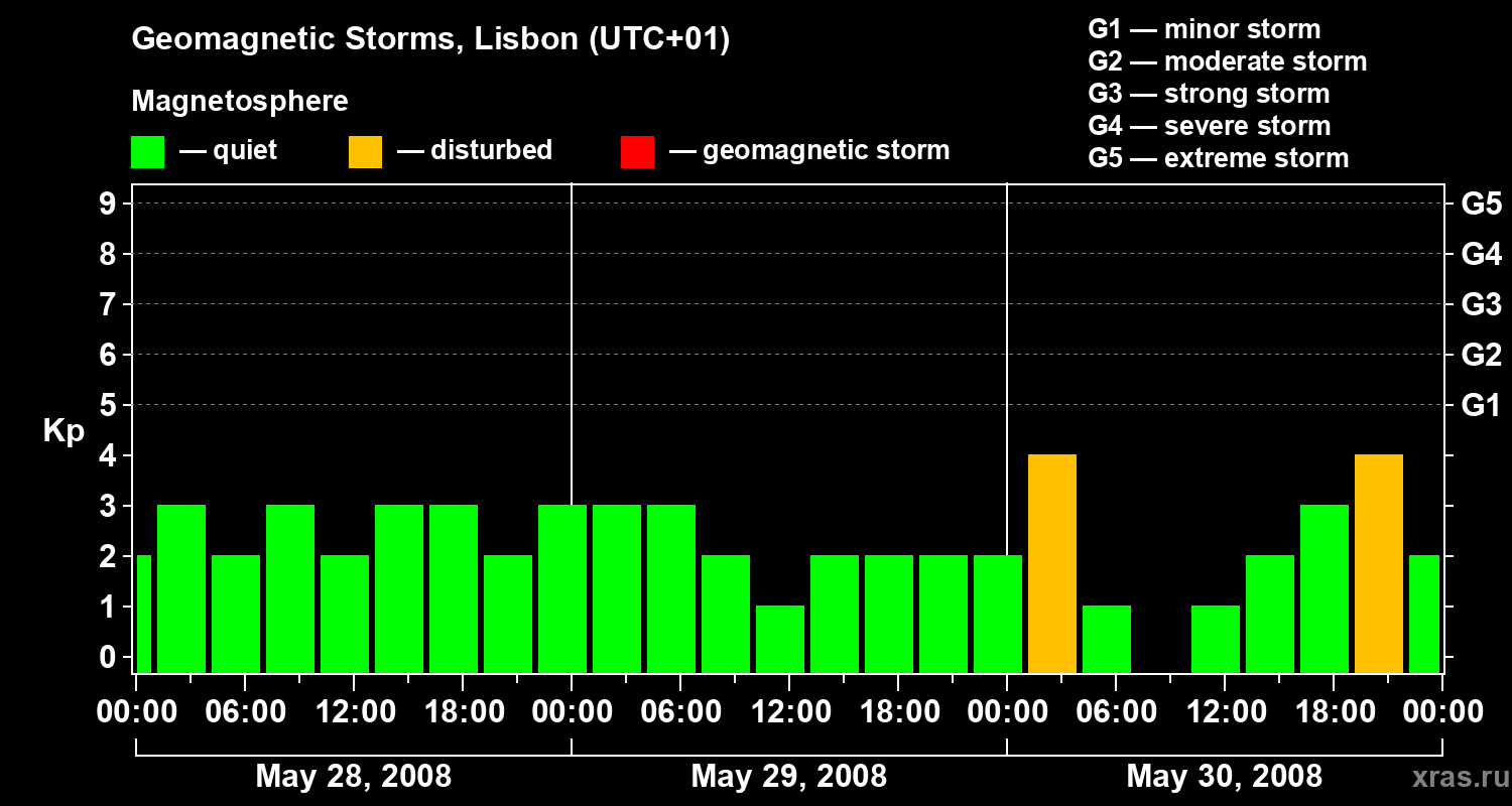 Changes in the geomagnetic index Kp from May 28 to 30, 2008 for mid latitudes