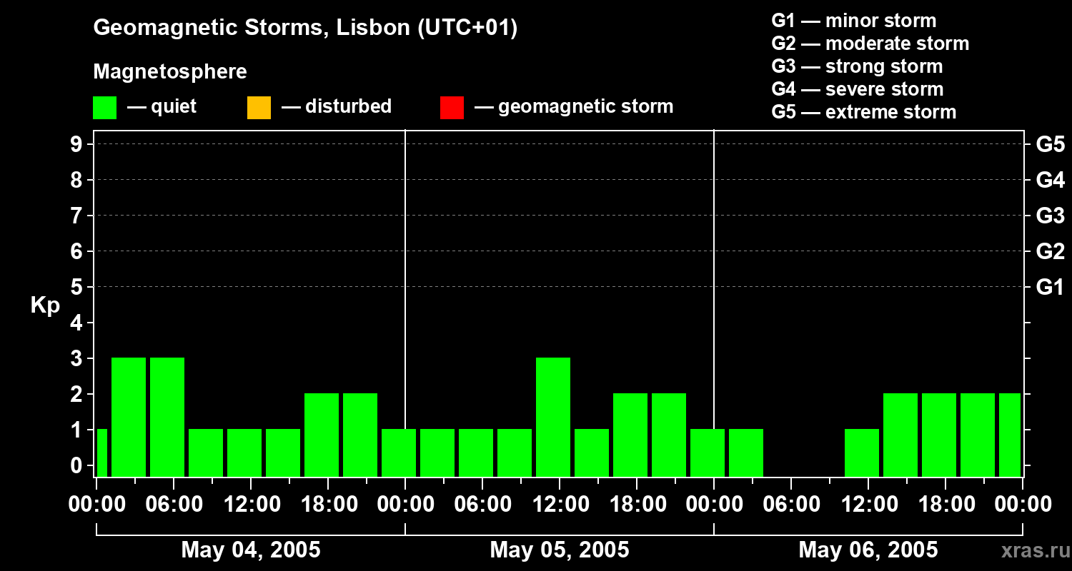 Changes in the geomagnetic index Kp from May 4 to 6, 2005 for mid latitudes