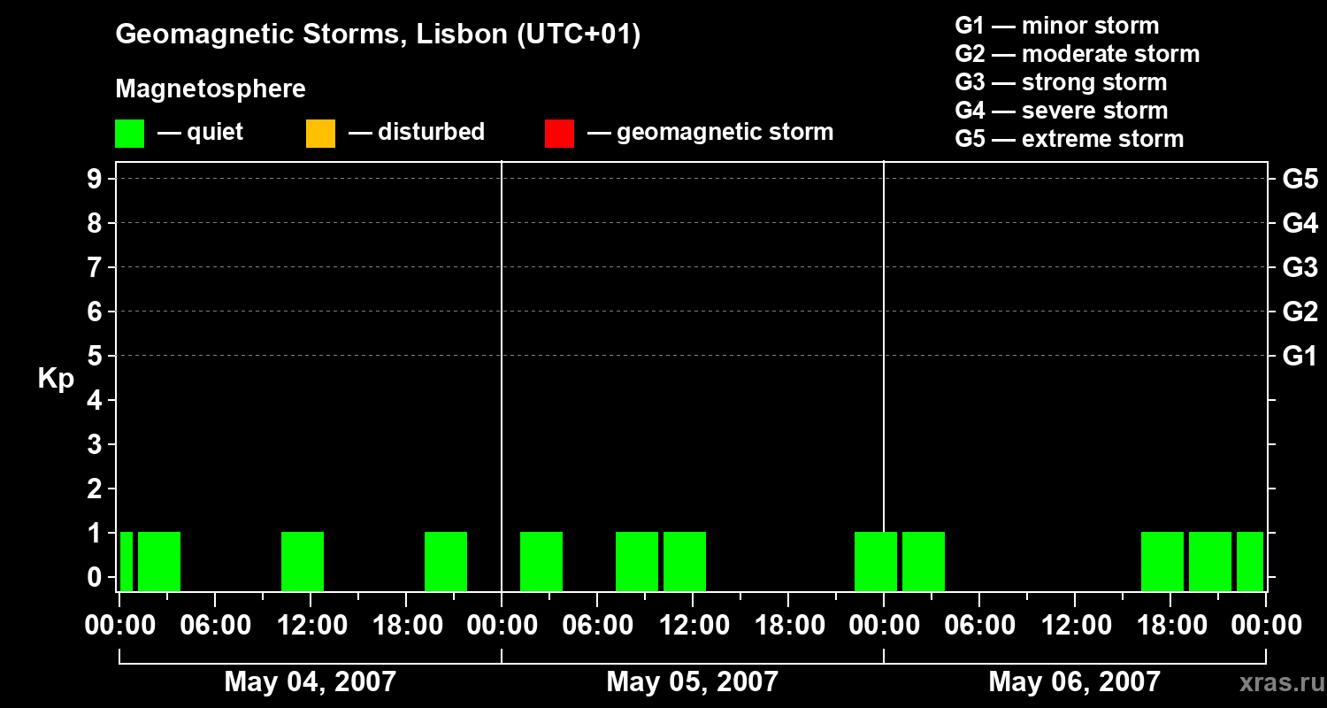 Changes in the geomagnetic index Kp from May 4 to 6, 2007 for mid latitudes