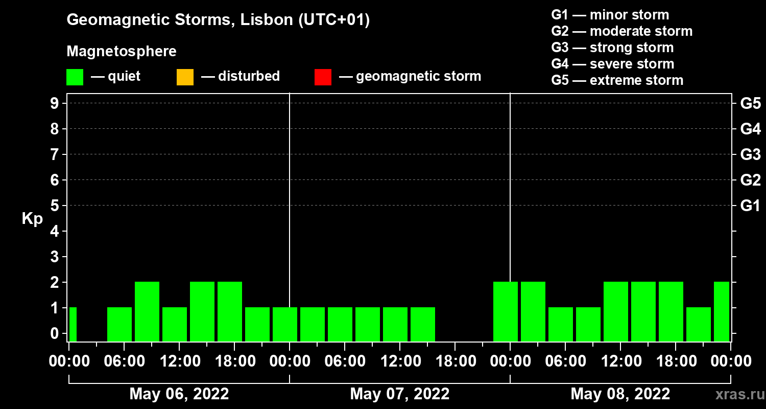 Changes in the geomagnetic index Kp from May 6 to 8, 2022 for mid latitudes