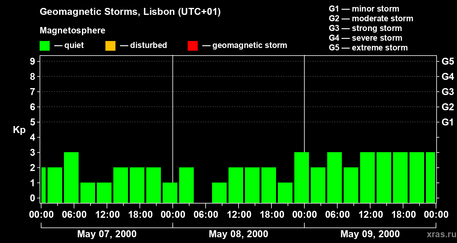 Changes in the geomagnetic index Kp from May 7 to 9, 2000 for mid latitudes