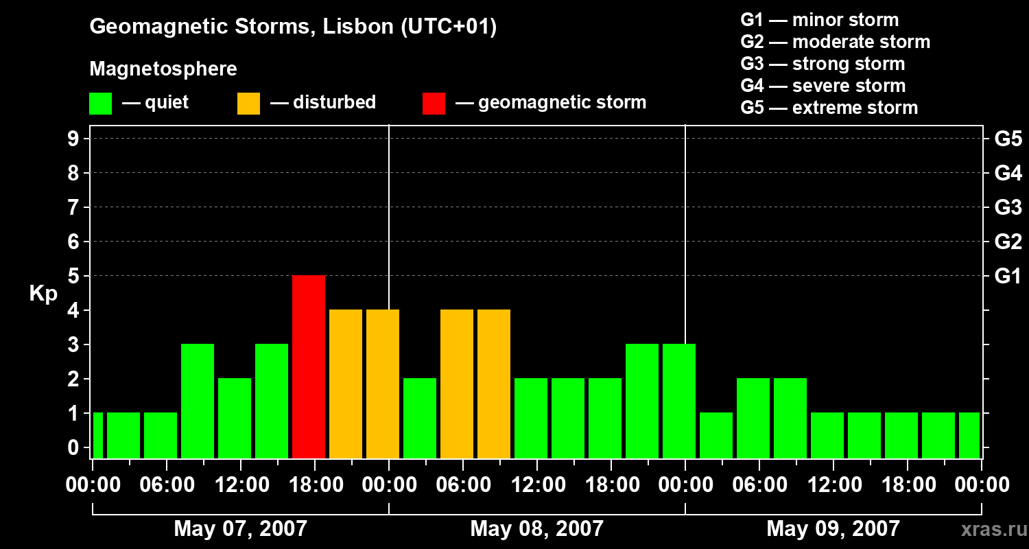 Changes in the geomagnetic index Kp from May 7 to 9, 2007 for mid latitudes