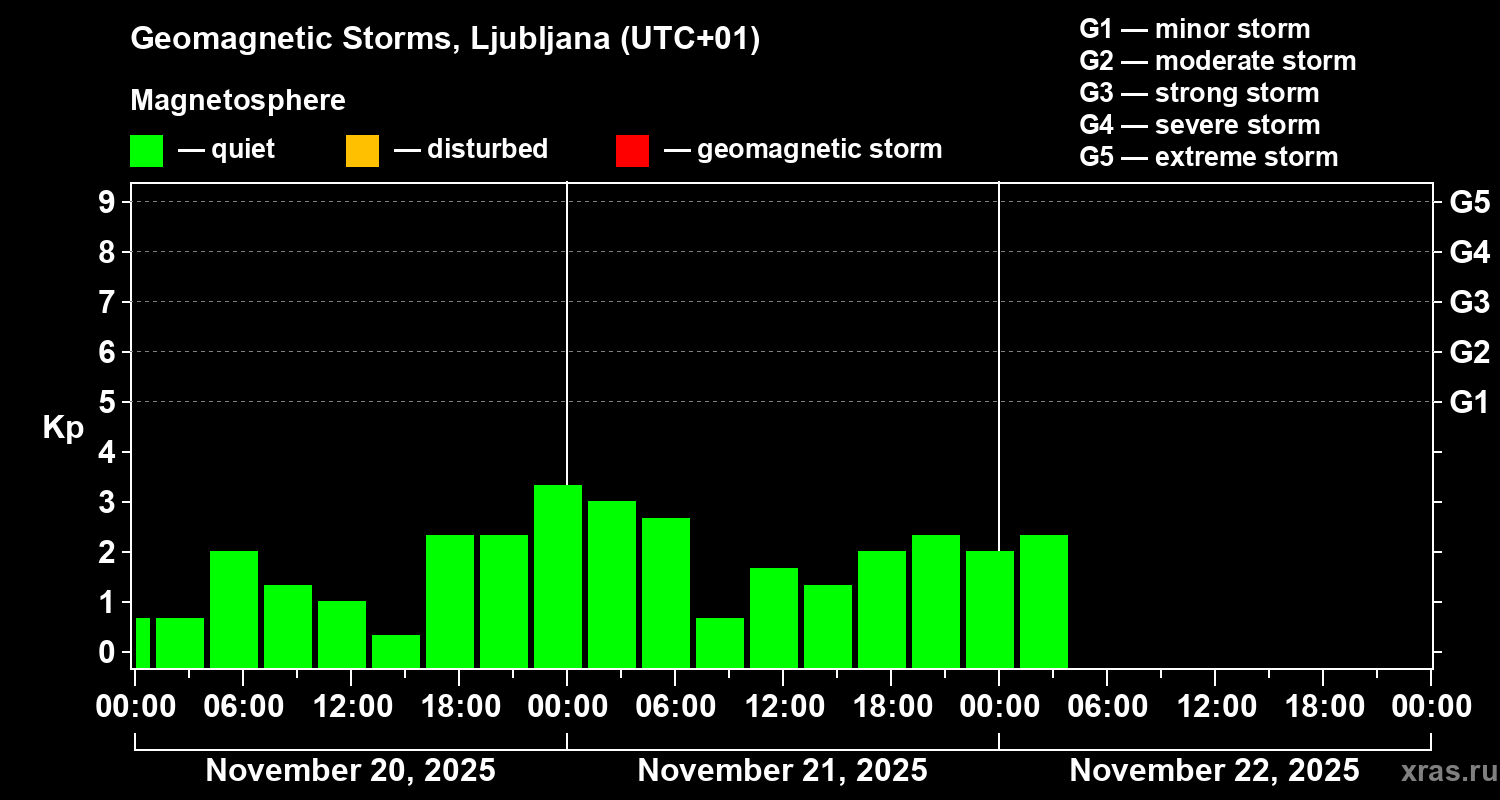 Изменения геомагнитного индекса Kp с 20 по 22 ноября 2025 года для средних широт