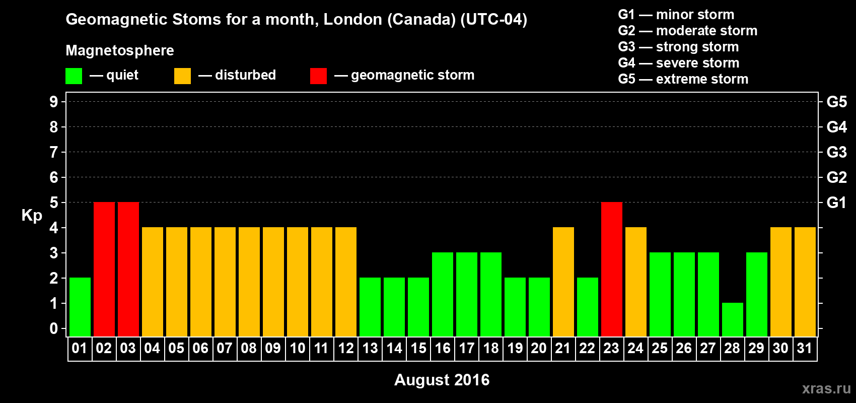 Geomagnetic storms in London (Canada) in August 2016