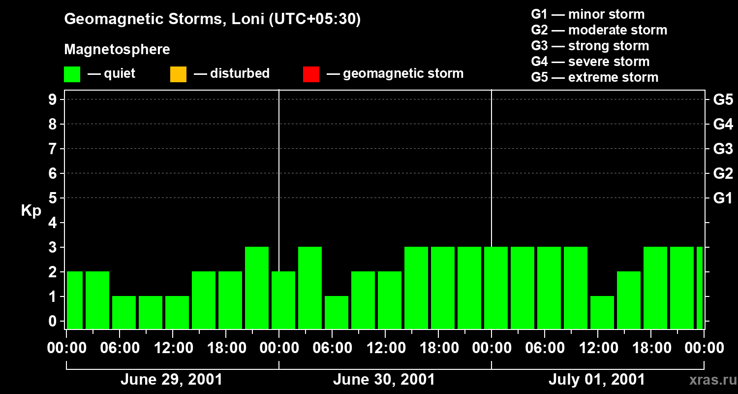 Changes in the geomagnetic index Kp from June 29 to July 1, 2001 for mid latitudes