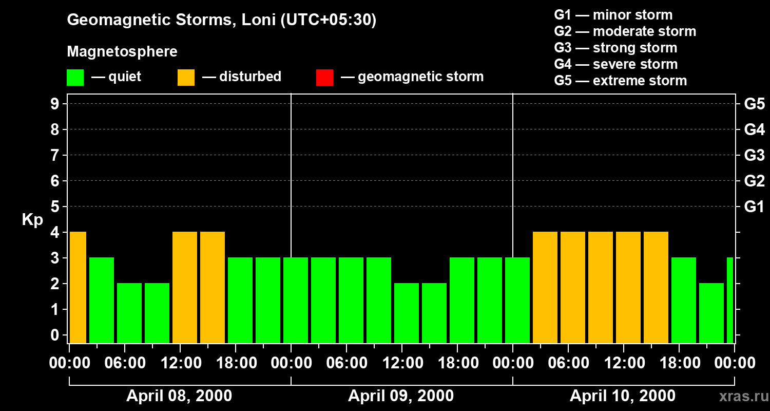 Changes in the geomagnetic index Kp from April 8 to 10, 2000 for mid latitudes