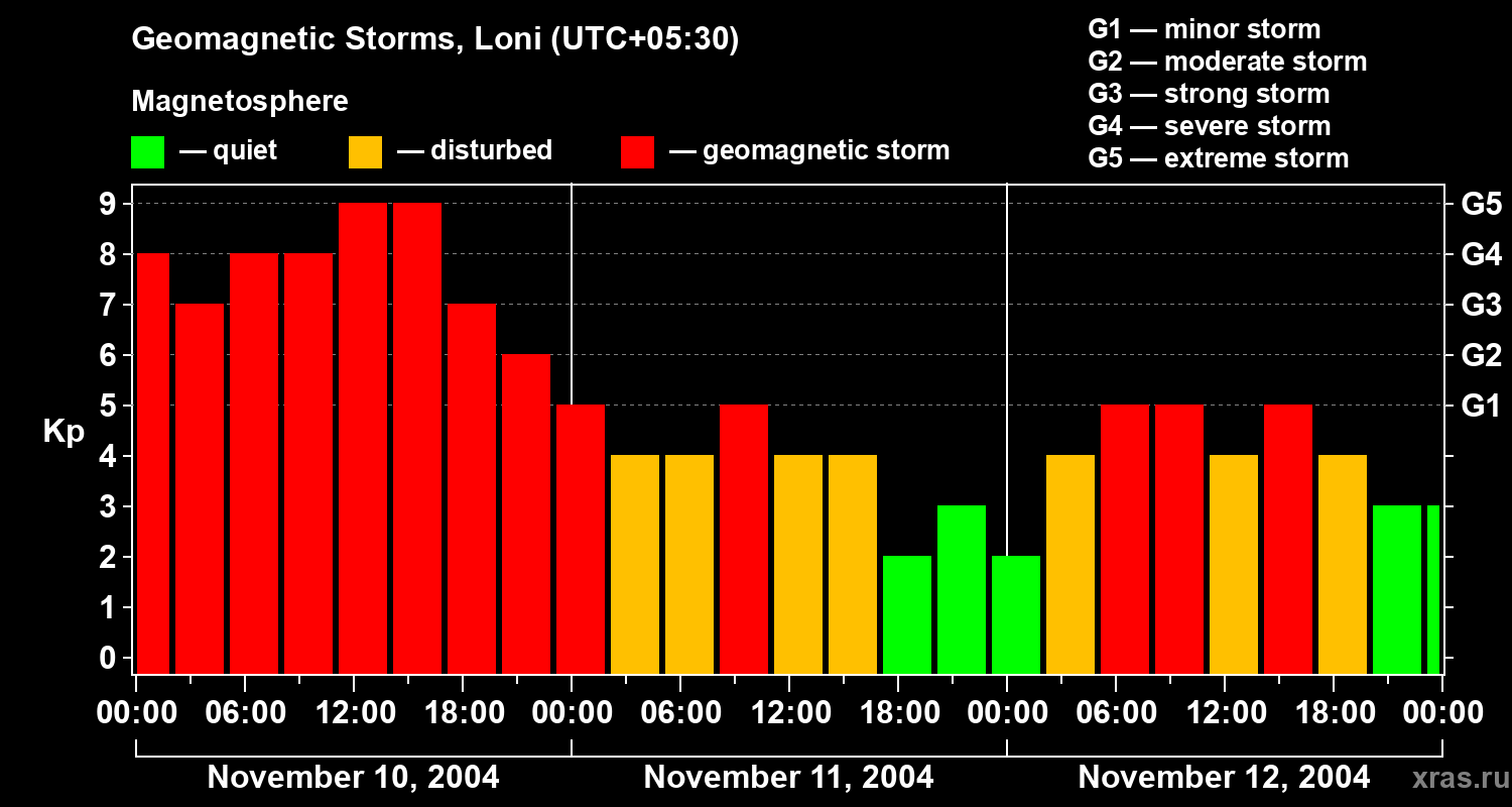 Changes in the geomagnetic index Kp from November 10 to 12, 2004 for mid latitudes