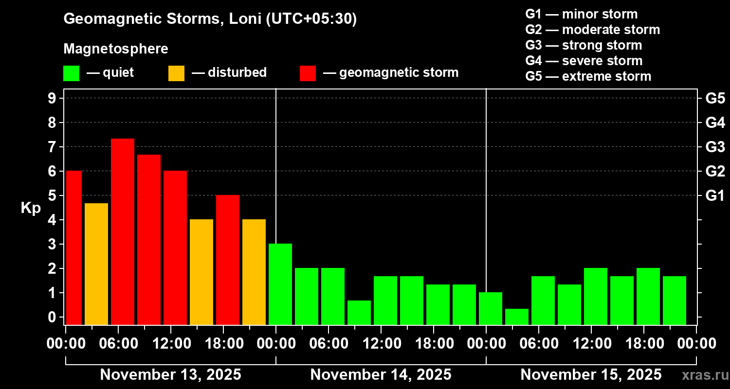Changes in the geomagnetic index Kp from November 13 to 15, 2025 for mid latitudes