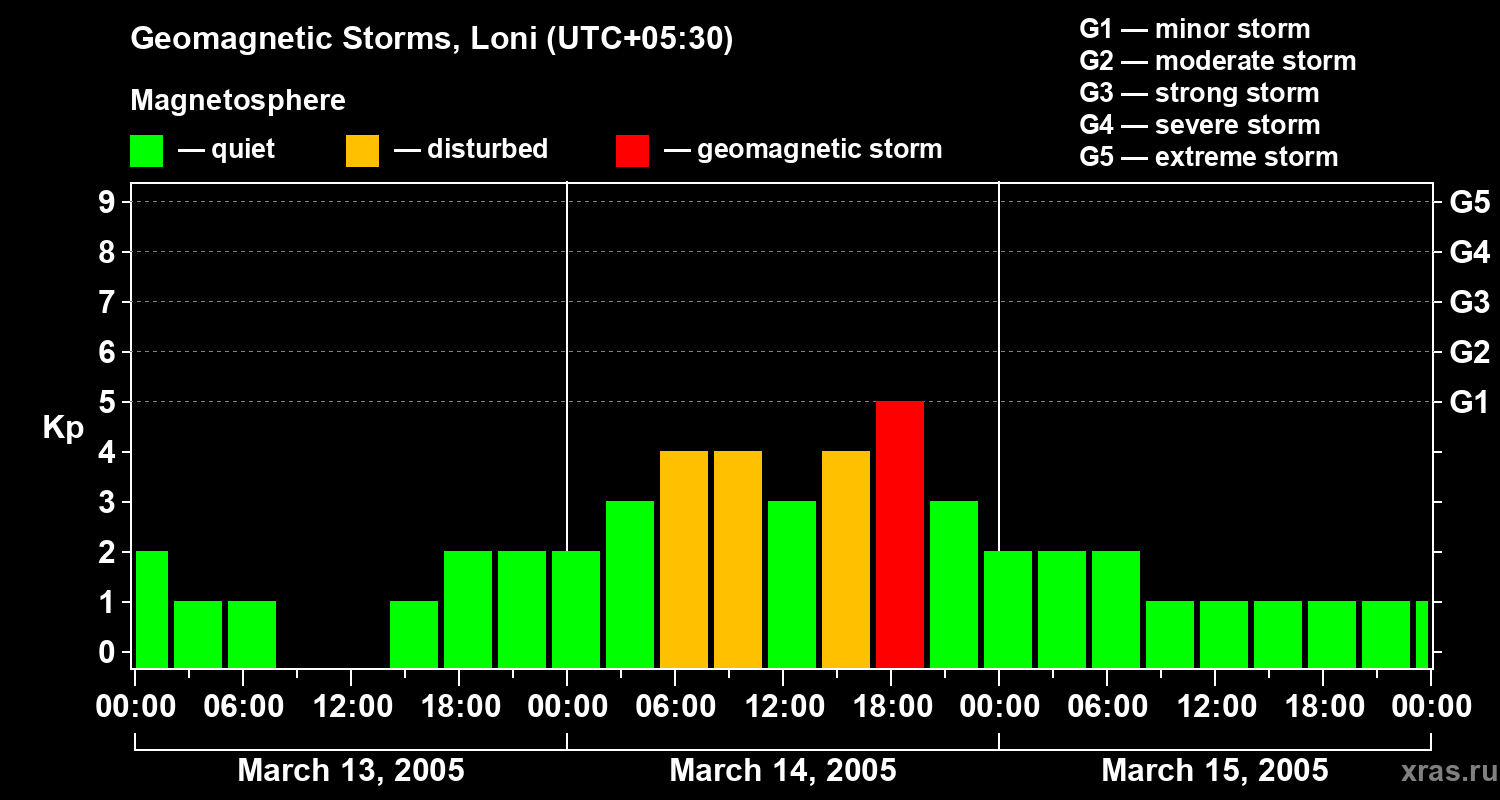 Changes in the geomagnetic index Kp from March 13 to 15, 2005 for mid latitudes