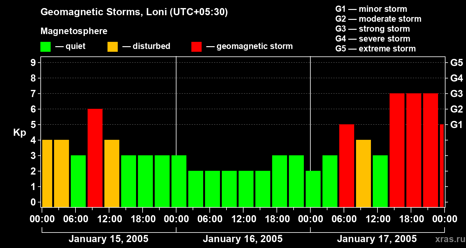 Changes in the geomagnetic index Kp from January 15 to 17, 2005 for mid latitudes