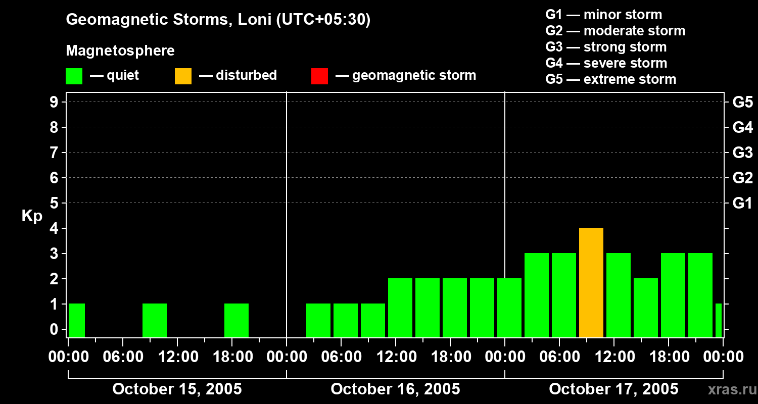 Changes in the geomagnetic index Kp from October 15 to 17, 2005 for mid latitudes