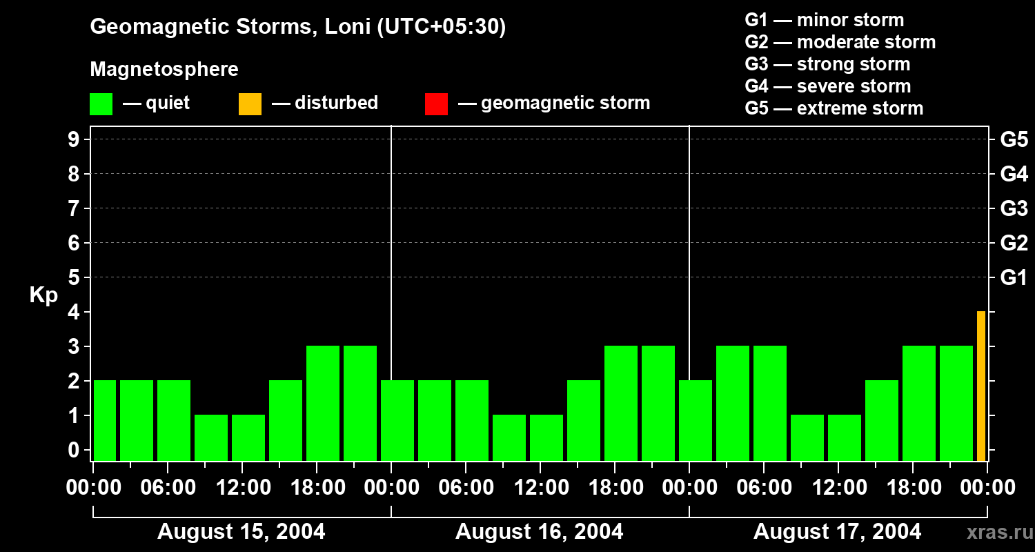 Changes in the geomagnetic index Kp from August 15 to 17, 2004 for mid latitudes