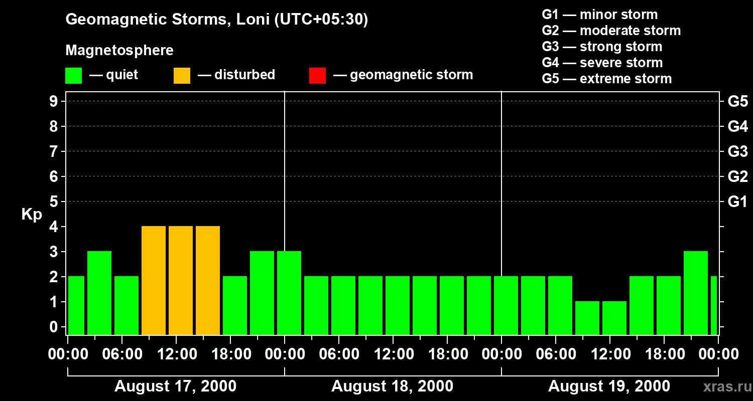 Changes in the geomagnetic index Kp from August 17 to 19, 2000 for mid latitudes