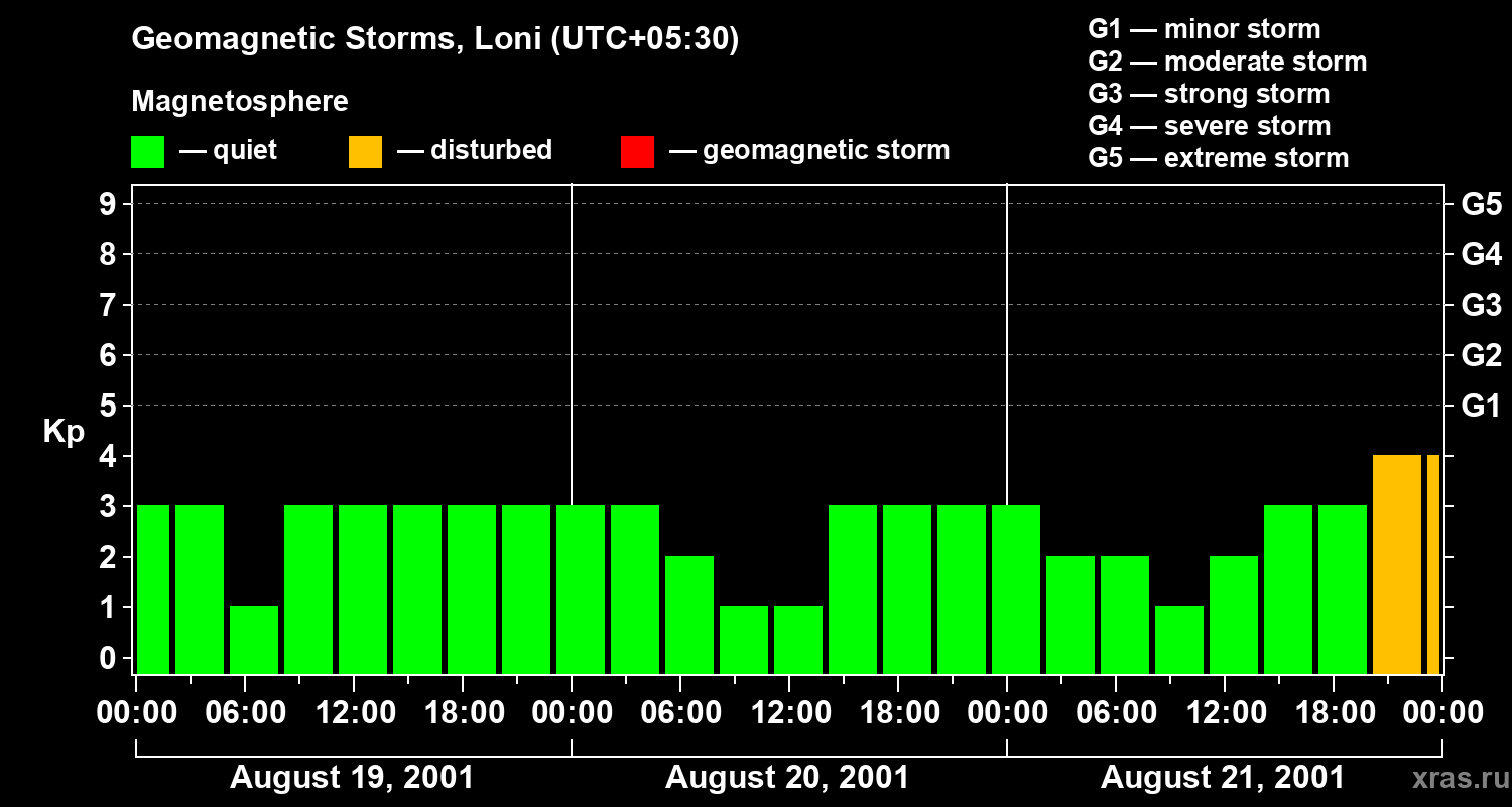 Changes in the geomagnetic index Kp from August 19 to 21, 2001 for mid latitudes