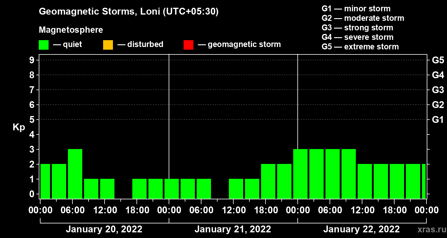 Changes in the geomagnetic index Kp from January 20 to 22, 2022 for mid latitudes