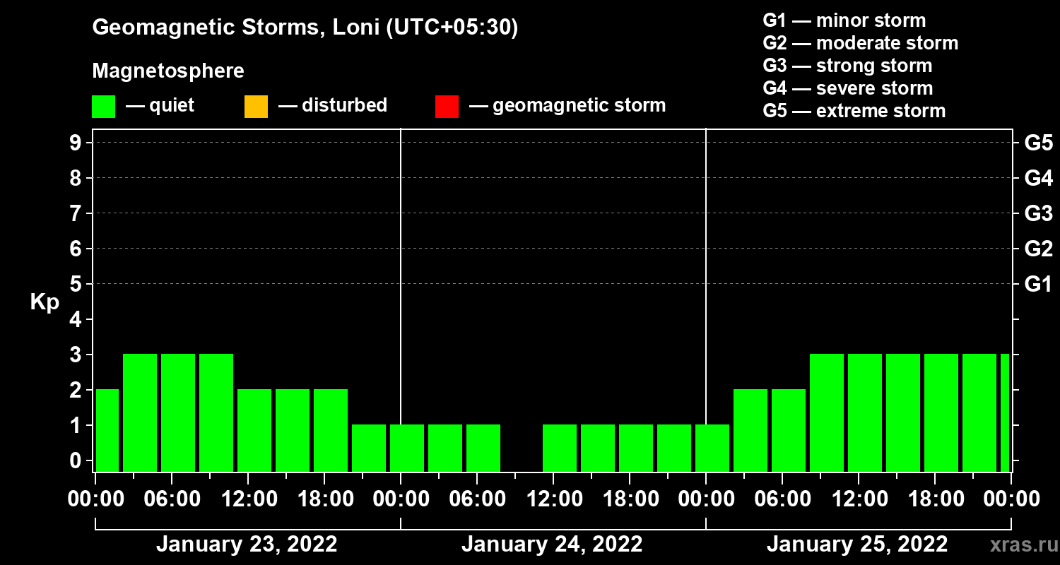 Changes in the geomagnetic index Kp from January 23 to 25, 2022 for mid latitudes